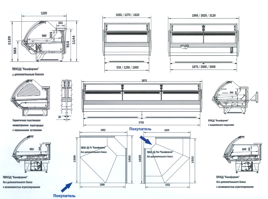 Схемы витрин холодильных модельного ряда «Калифорния»